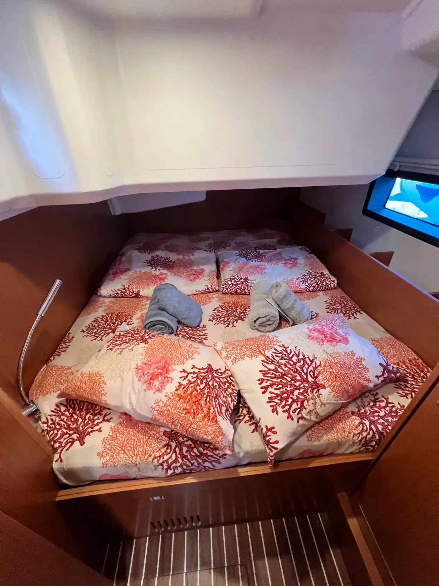 The boat has 3 cabins plus the salon, with 6–7 comfortable berths. For the best experience, we recommend up to six guests. The salon berth can be used if needed, but most guests prefer to keep it as a relaxing common area.